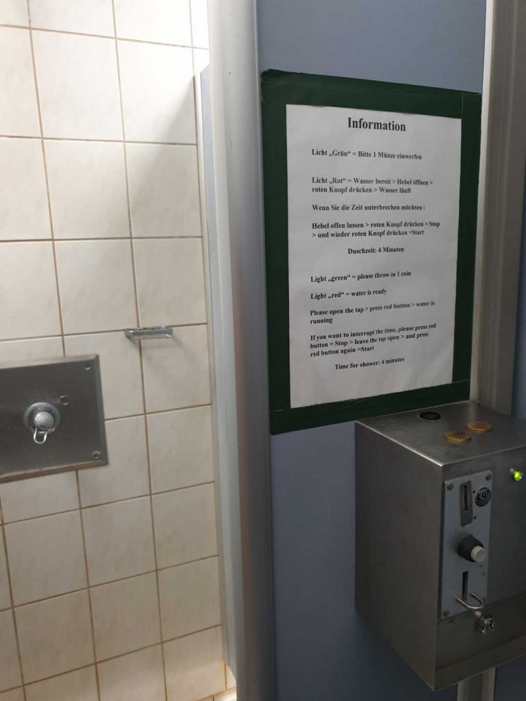 Am Campingplatz angekommen gleich zur Anmeldung. Die Begrüßung war sehr freundlich. Nach Erledigung der Formalitäten wurde uns persönlich der Stellplatz gezeigt. Dieser war so eben, dass kein Ausrichten auf der Querachse nötig und genug Platz zum Rangieren da war. Strom und Wasser direkt am Platz. Der Stellplatz ist 90 bis 100 m2 groß. Was will man mehr.