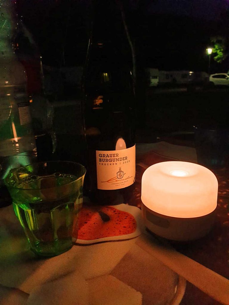 Theoretisch schon eingelesen geht’s an die Umsetzung. Also Wassertanks gefüllt, Stromkabel und Gasflasche angeschlossen, Chemie-WC mit Schlumpfblau versorgt. Sonnensegel dran und Campingmobiliar aufgestellt. Wir haben fertig !.