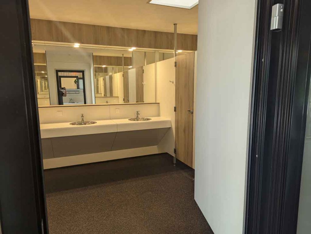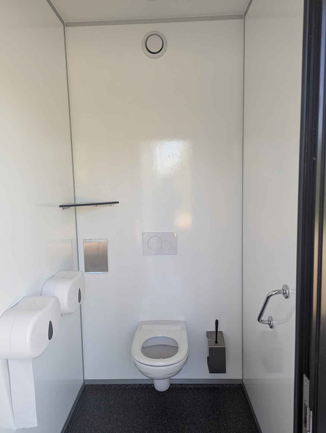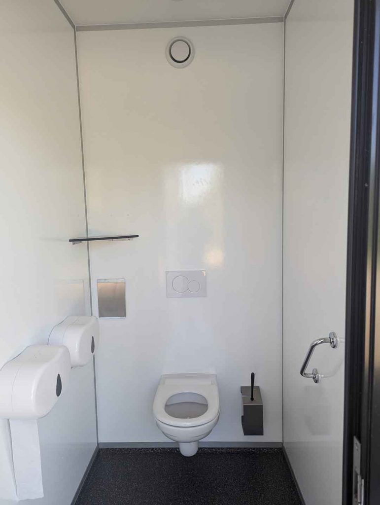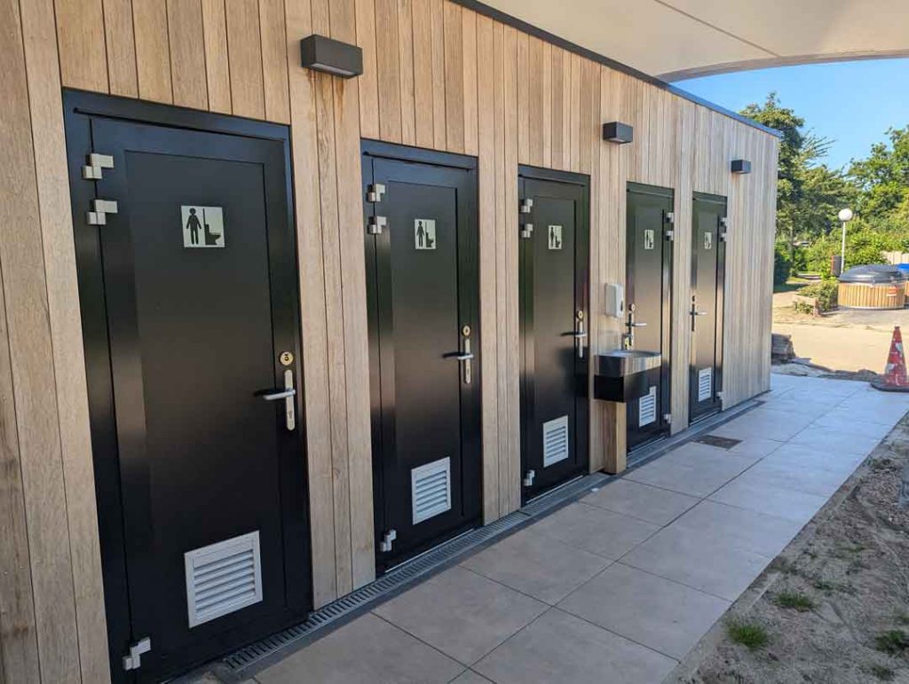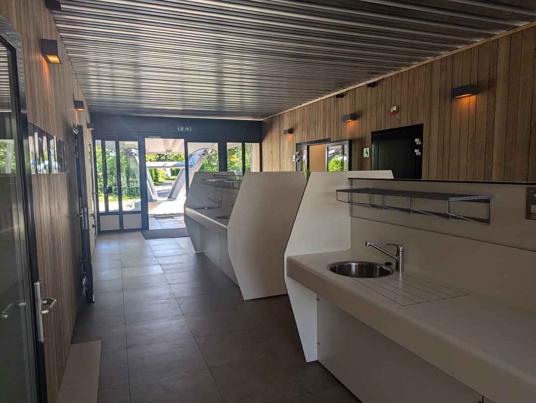 Das neue bzw. fertiggestellte Sanitärgebäude befindet sich in unmittelbarer Nähe zu unserem Stellplatz. Es wird mehrere Male am Tag gereinigt. In diesen befinden sich die Toiletten, Dusche, Kindersanitärbereiche, Badezimmer für Behinderte, Spülplätze, Waschmaschinen und Trockner. Direkt daneben die Entsorgung für Chemietoiletten.