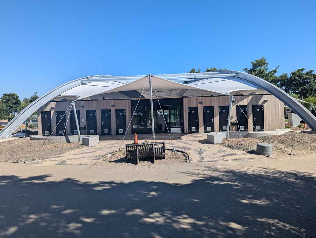 Rezeption, Restaurant, Frituur und Minimarkt zentral in einem GebÀude am Eingang zum Campingplatz. Da wir Online gebucht hatten, war ein persönlicher Check-In nicht nötig. Dank Nummernschilderkennung an der Schranke konnten wir an den wartenden Camperkollegen einfach vorbeizuckeln und direkt zu unserem Stellplatz fahren.