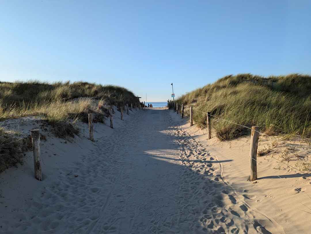 Der Strand ist etwa 1200 Meter vom Campingplatz entfernt und ĂŒber einen dafĂŒr angelegten Weg durch das sehr schöne Naturgebiet erreichbar. An diesem Strandabschnitt sind Hunde an der Leine erlaubt. Der Nacktbadestrand befindet sich links beim Strandpavillon Aloha Beach. Der gesamte ĂŒbrige Strand ist Textilstrand. WĂ€hrend der Hochsaison befindet sich dort auch eine Strandwacht.