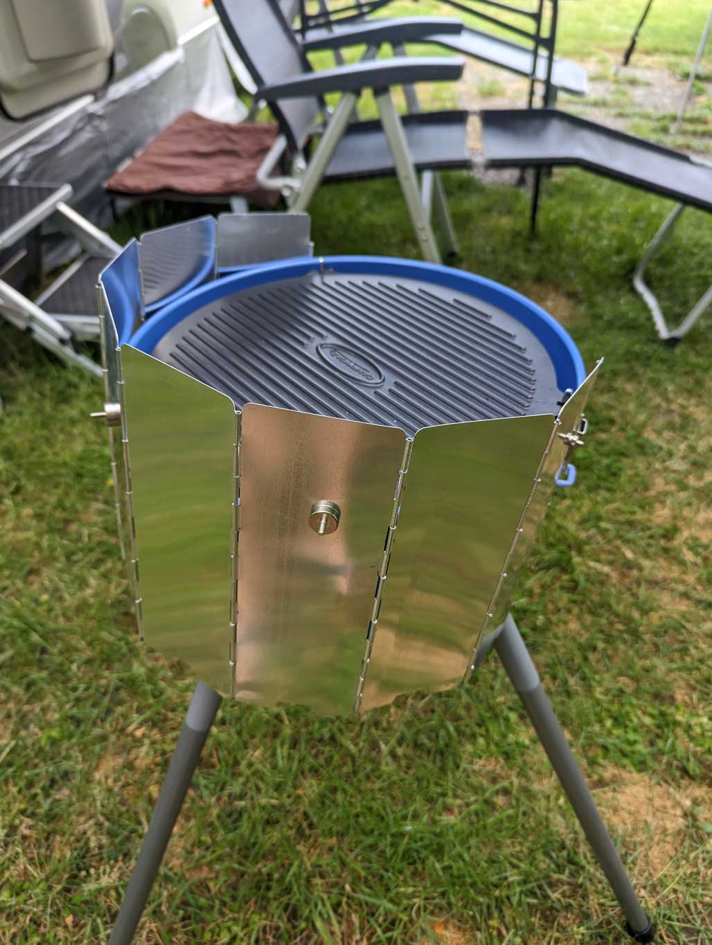 Ein Windschutz muss her. Der Campingaz CV400 Grill reicht für 2 Personen locker aus und hat sich bisher auch gut geschlagen. Was mir aber nicht so ganz behagt ist die Windanfälligkeit. Da es leider im Netz keinen passenden Windschutz gibt, habe ich mir was gebastelt. Windschutz und Spritzschutz in Einem sozusagen. Dazu einfach einen faltbaren Windschutz genommen, 2 Löcher reingebohrt, 2 Magnete angeschraubt und 2 Magnete als zusätzliche Halterung benutzt.
