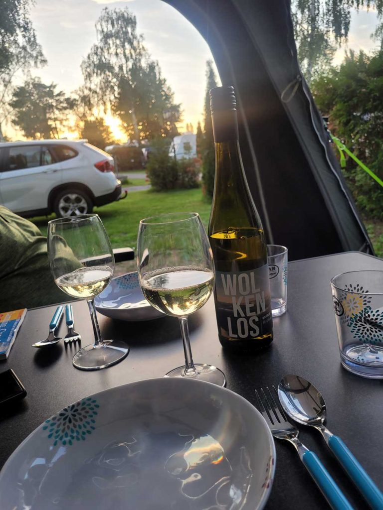 Premiere für unser „neues“ gebraucht gekauftes Luftvorzelt, Kampa Ace Air 300. Schnell aufgepumpt und abgespannt.