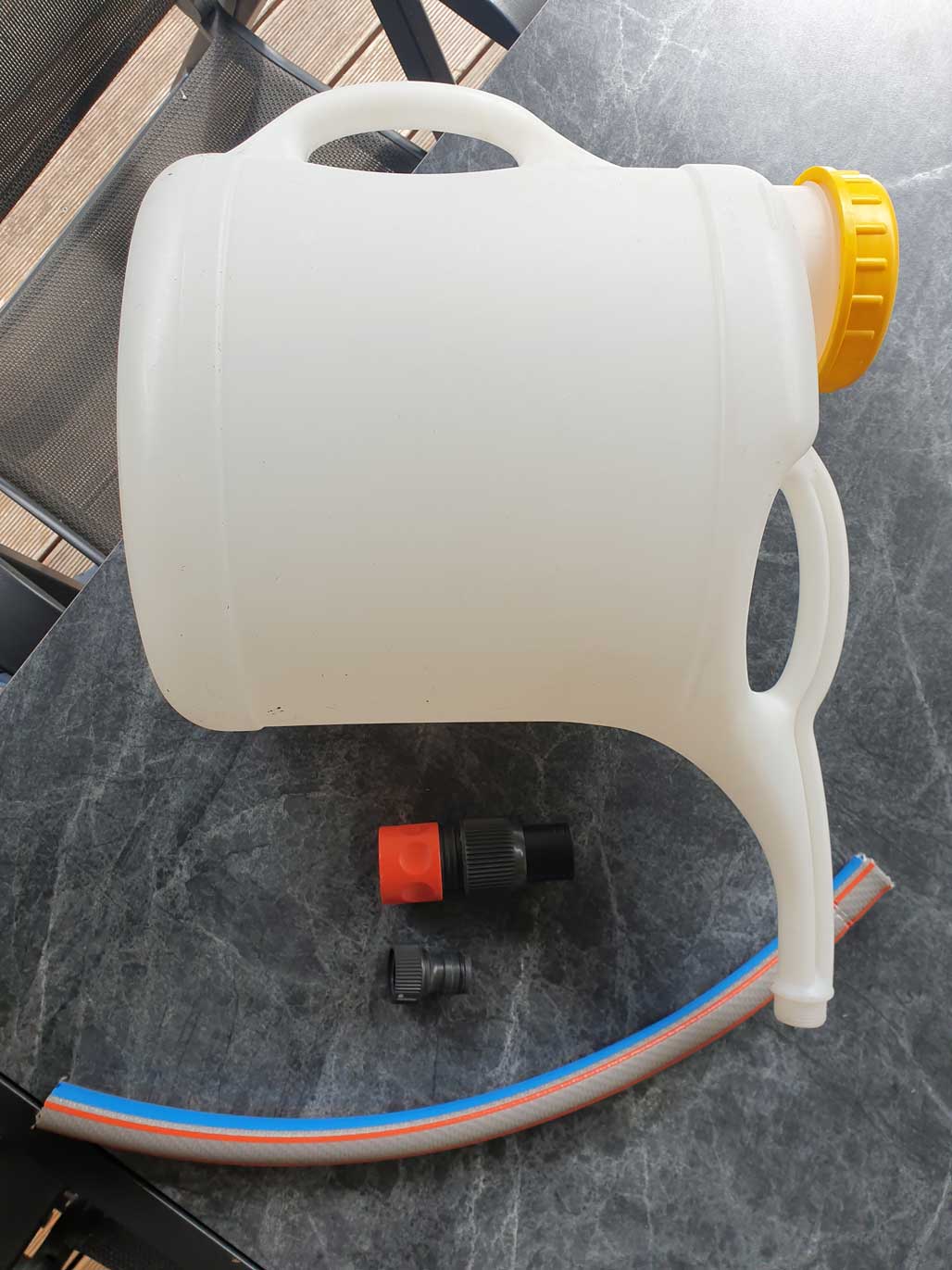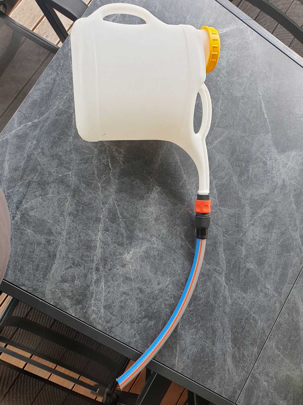 Zum Glück hat diese Wasserkanne ein 3/4 Zoll Gewinde am Auslaufstutzen. Die Frischwasserkanne habe ich mir bei Fritz Berger Camping besorgt. Gibt es aber u.a. auch bei Obelink oder bei Camping Wagner.