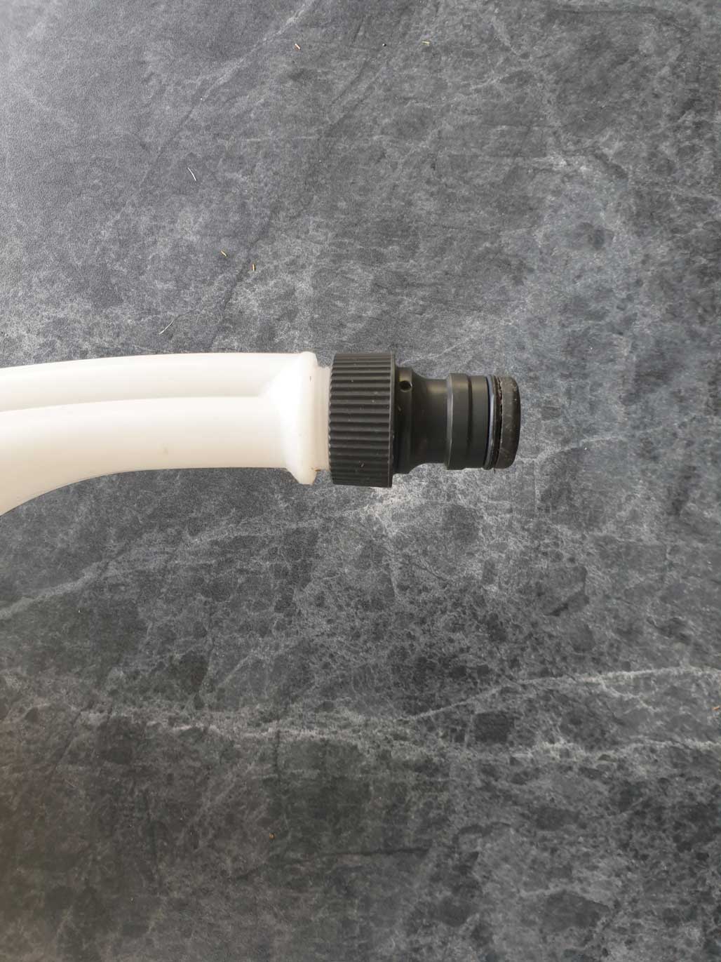 Es gibt bestimmt auch alternative Teile von anderen Herstellern. Einfach das nehmen, womit man die besten Erfahrungen bisher gemacht hat. Das Hahnstück vorne an den Kannenauslauf schrauben. Den Schlauch auf die gewünschte Länge abschneiden und mit der Schnellkupplung verbinden. Aufstecken. Fertig.